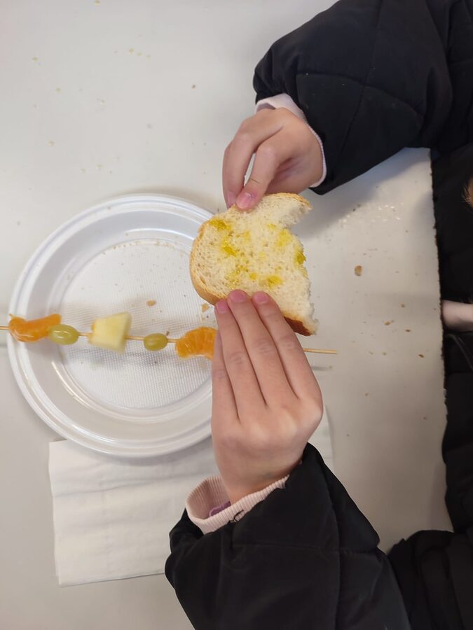 El alumnado disfruta de un desayuno saludable a base de pan de aceite y diversidad de fruta: kiwis, plátanos, mandarinas, etc. El alumnado disfruta mucho con la actividad por muy simple que parezca ya que muchos son los que no toman a diario una tostada con aceite.